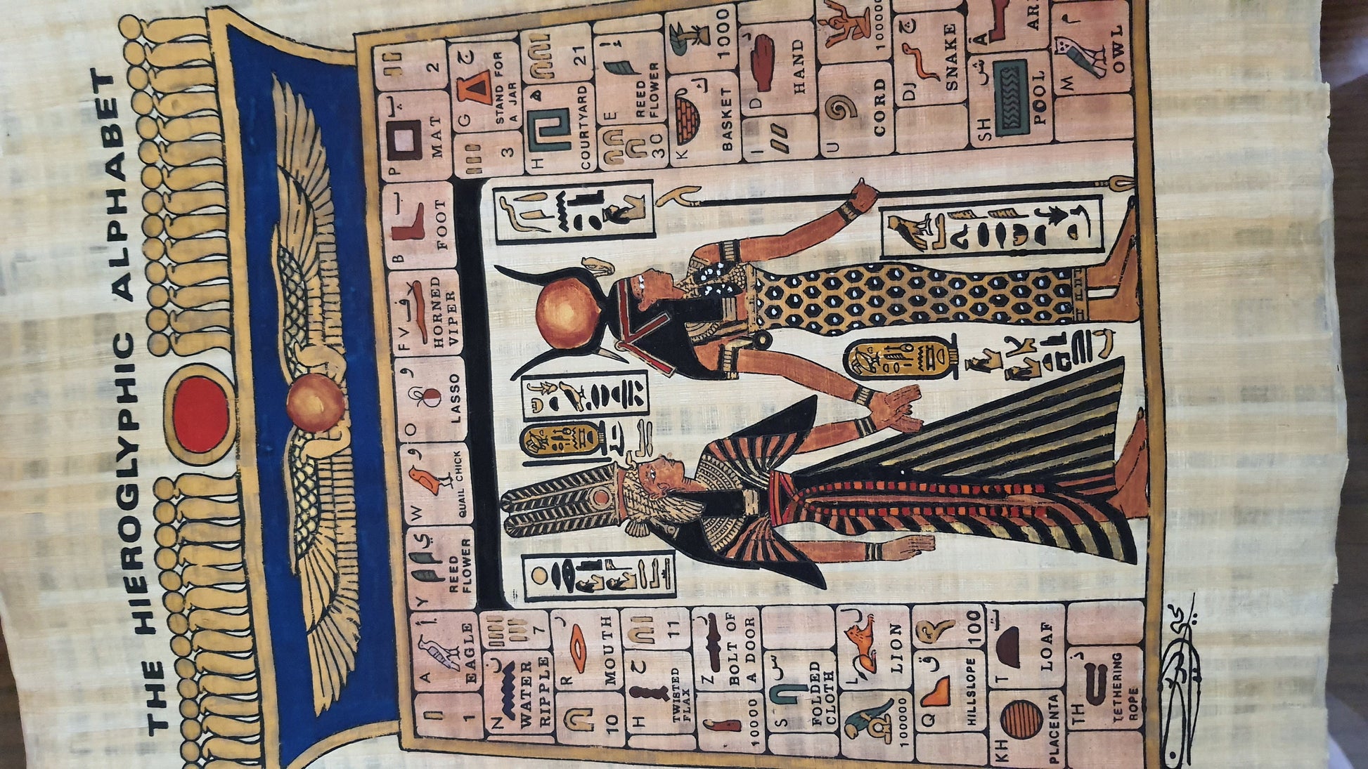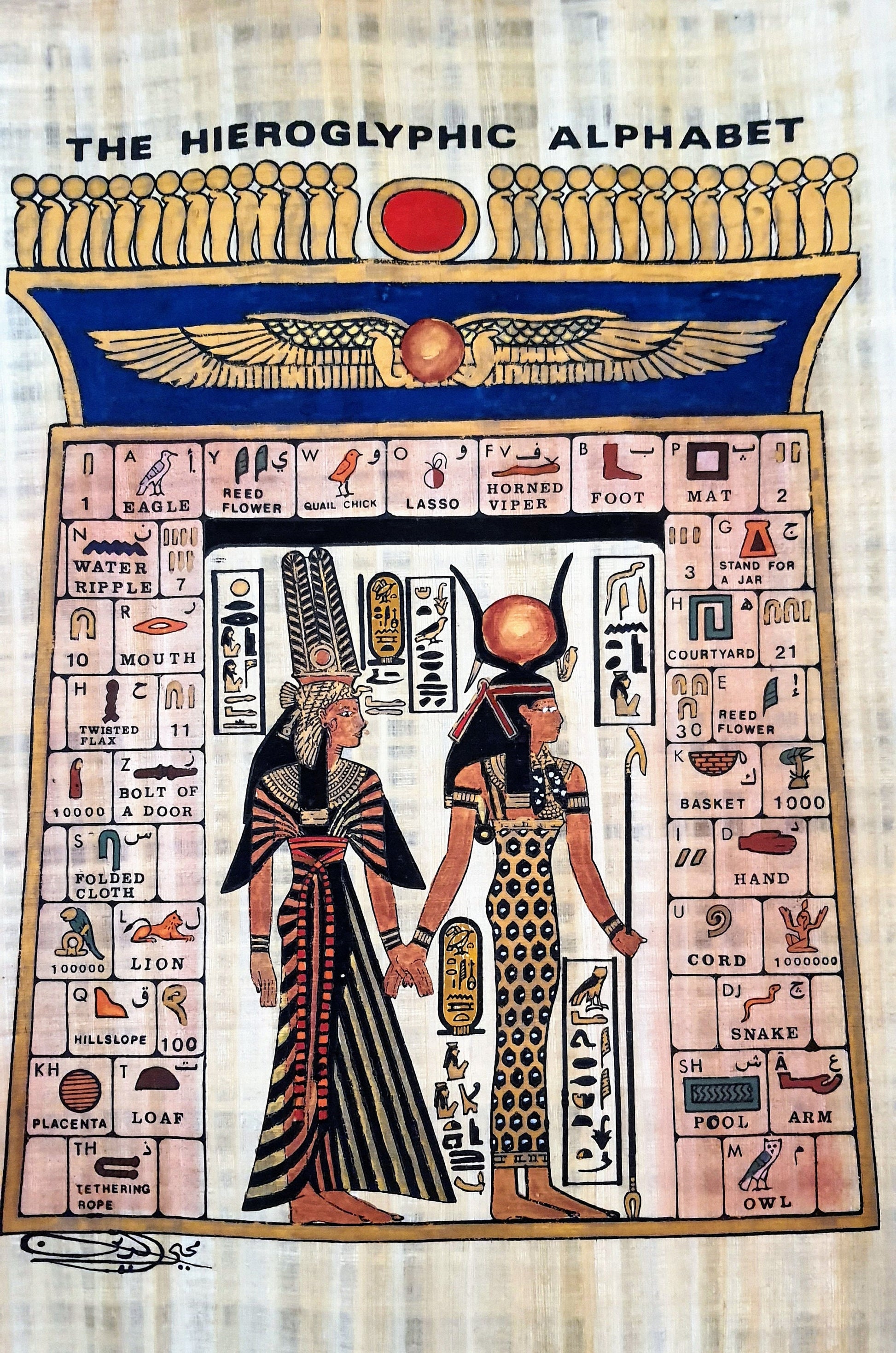 Queen Nefertari and ISIS with Hieroglyphics alphabet, 17"x14" Handmade, Hand-Painted Papyrus, Ancient Egyptian Art, Frameable